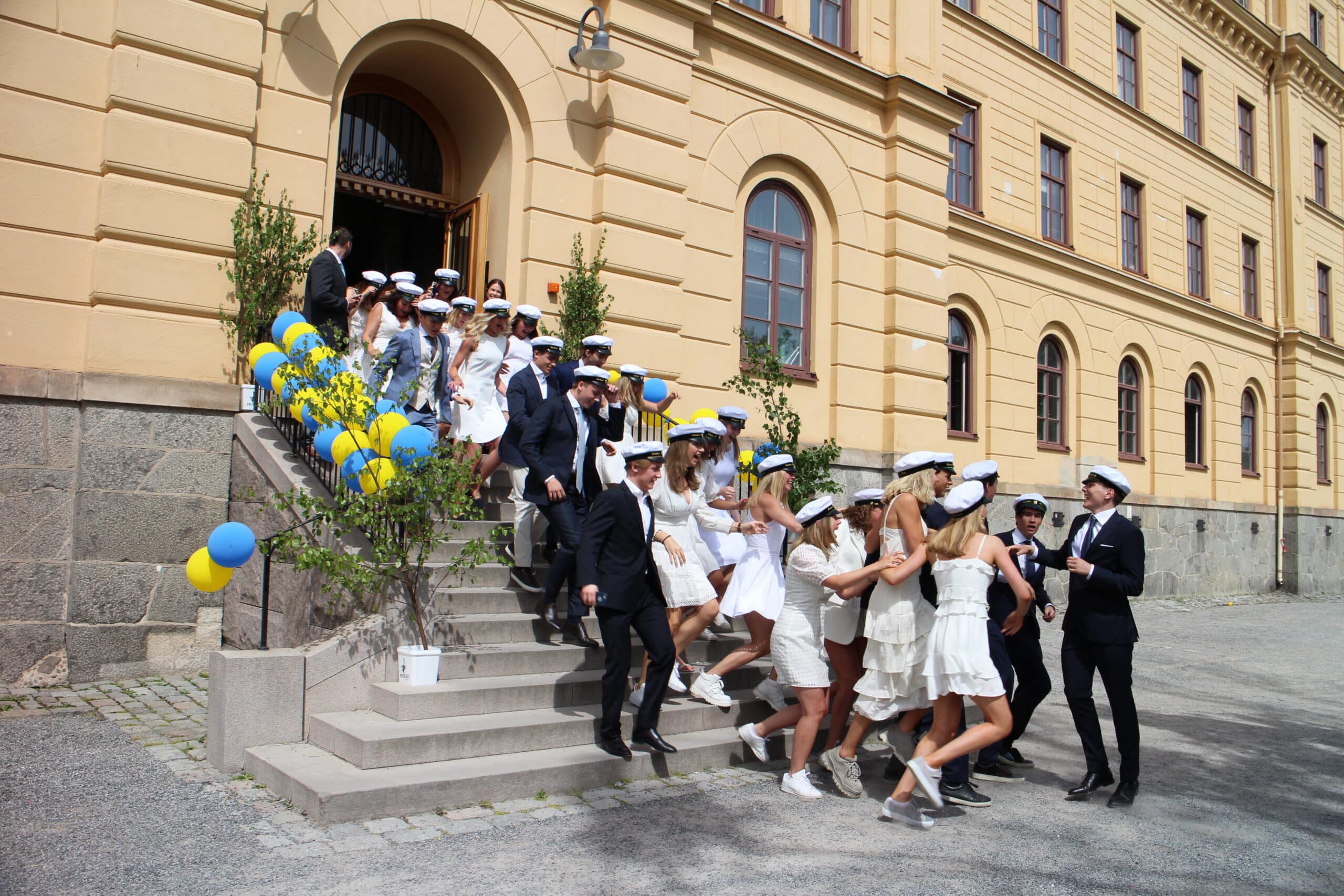 Studenten äger rum tisdag 11 juni 2024. Familj och vänner är välkomna till gräsytan vid vattnet nedanför skolan. Eleverna springer ut på trappan mot vattnet.